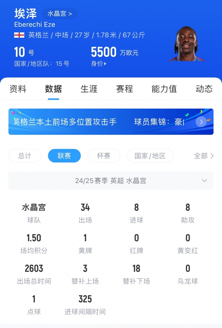埃泽上赛季为水晶宫出战43场比赛,打进14球,助攻11次,他与水晶宫的合同将在2027年到期。
