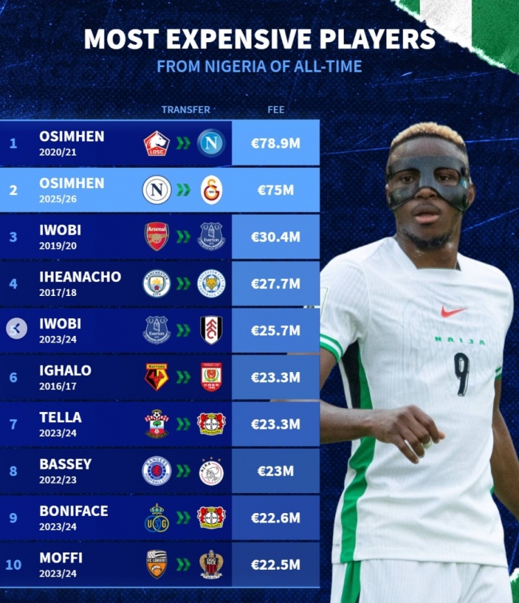 7月31日讯 奥斯梅恩转会加拉塔萨雷只待官宣,《转会市场》也统计了尼日利亚球员历史转会费榜单,奥斯梅恩独占前二。