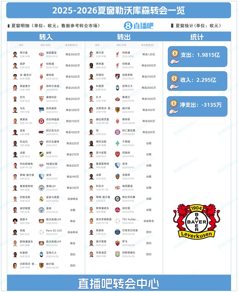 为吧友们总结了勒沃库森今夏的转会操作,吧友们能打几分?