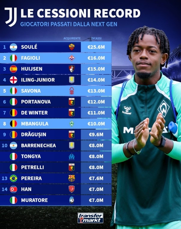 9月12日讯 德转统计了尤文新生代球员卖人榜,苏莱2560万欧加盟罗马居首,法乔利、赫伊森分居二三位。