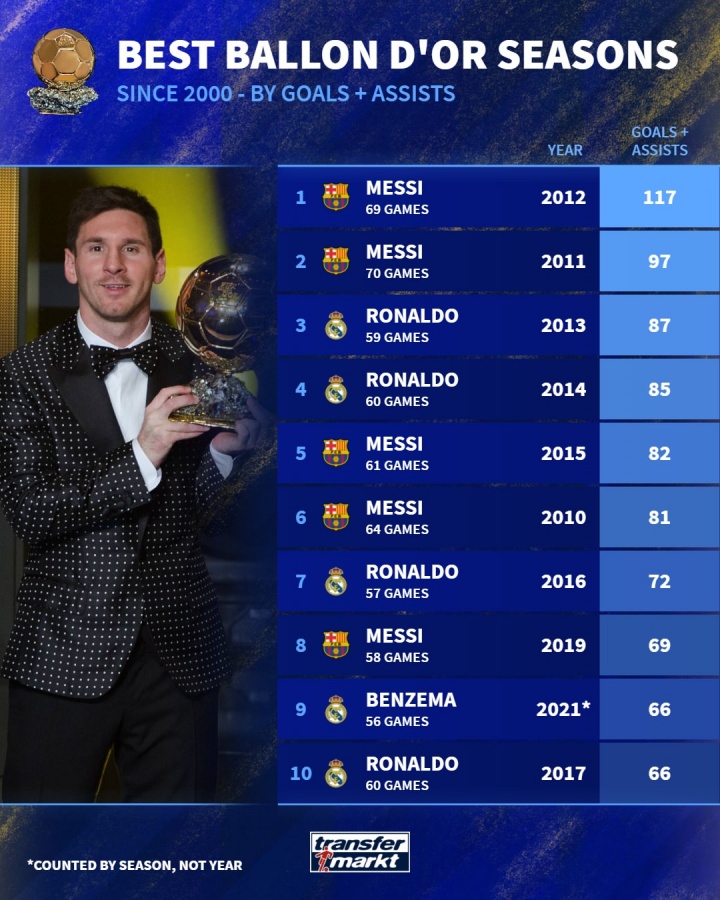 9月24日讯 2025年金球奖评选结果出炉,巴黎圣日耳曼边锋登贝莱夺魁。曾几何时,梅西和C罗主宰了金球奖的评选,两人之间的竞争成为足坛令人津津乐道的话题。德国转会市场盘点了2000年以来金球奖得主直接参与进球情况,梅西2012年69场117球居首。